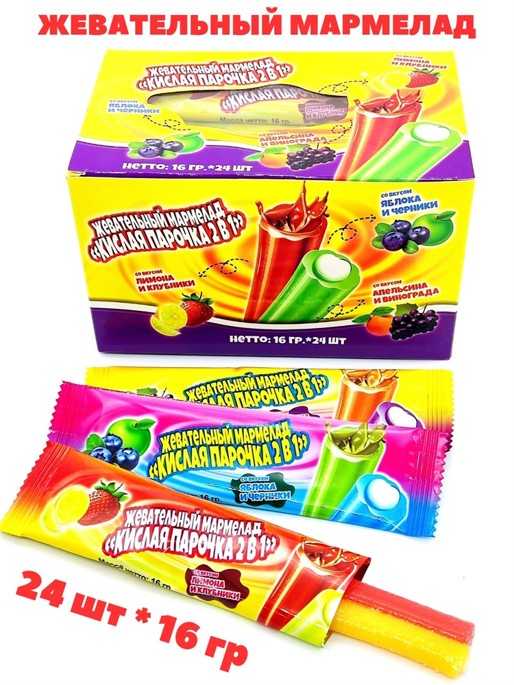 Жевательный фруктовый мармелад в виде трубочек КИСЛАЯ ПАРОЧКА 2 с разным вкусом 16 г. Индивидуально упакована. В блоке 24шт