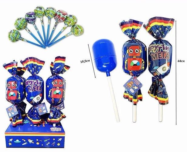 Карамель леденцовая на палочке Фрутти с ароматом клубники, винограда, груши, апельсина 12г с игрушкой для мальчиков в контейнере, пр-во Россия, 11 х 11 х 40 см.