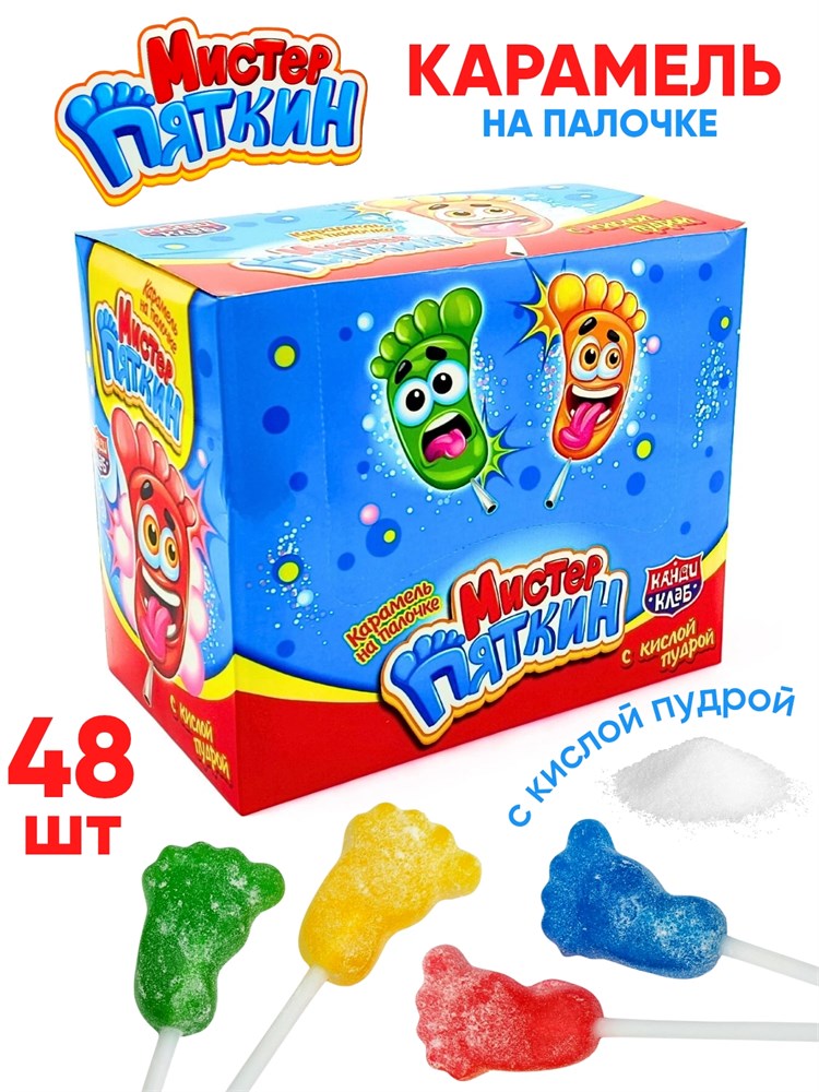 Карамель на палочке Мистер Пяткин с кислой пудрой ассорти (Канди Клаб) (CAR124-2) 11 гр*12 бл*48 шт