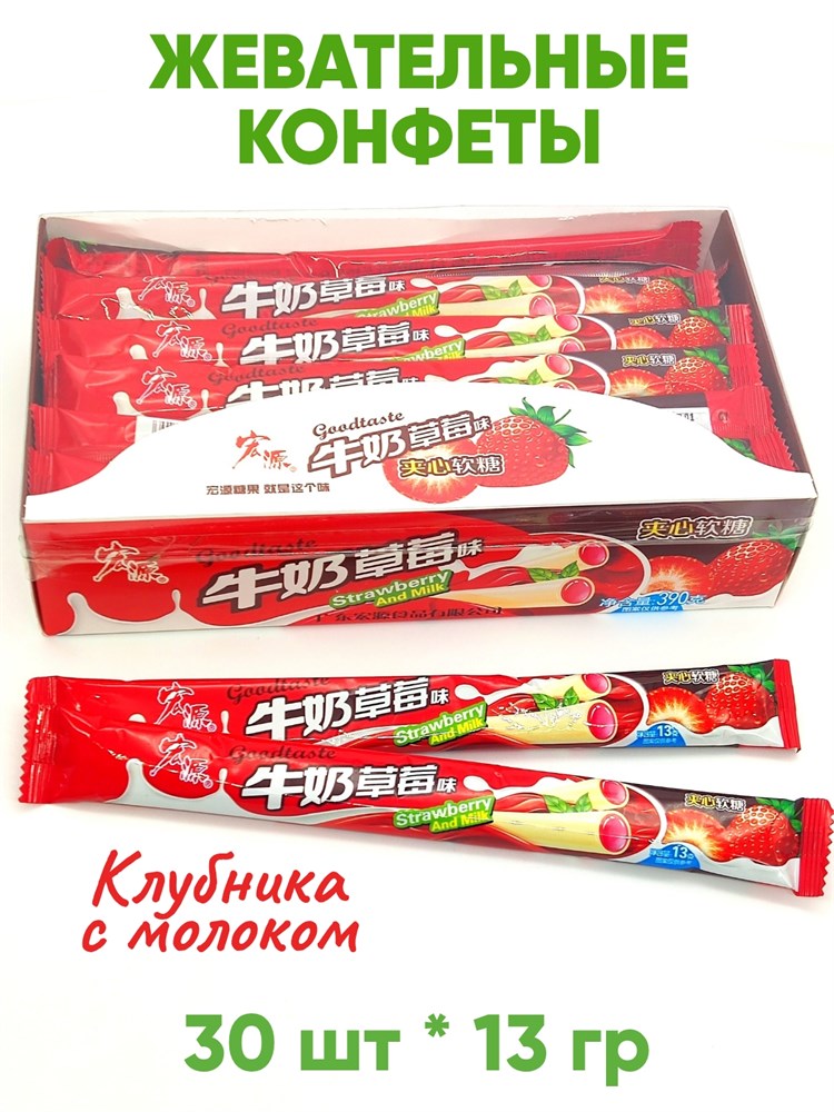 Конфеты жевательные Hongyuan Sour Milk трубочки Клубника и молоко (1236) 13 гр*1 кор х 16 бл х 30 шт