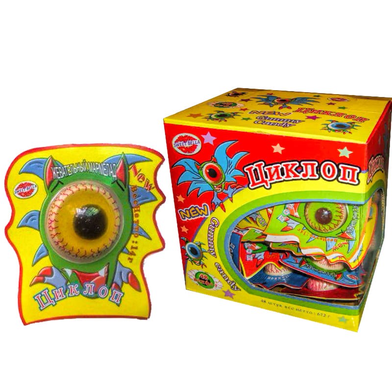 Жевательный мармелад в форме глаза в индивидуальной упаковке. Товар продается шоу-боксом с вложением 48 штук.