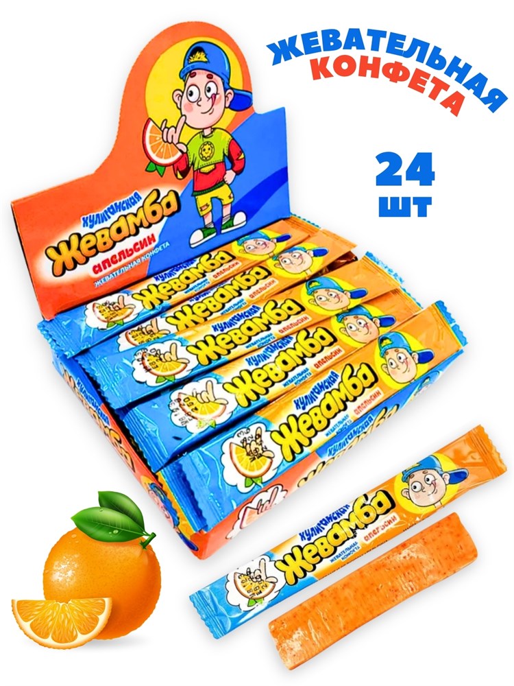 Жевательная конфета со вкусом апельсина в полимерной упаковке. Товар упакован в картонном блоке с вложением 24 штуки.