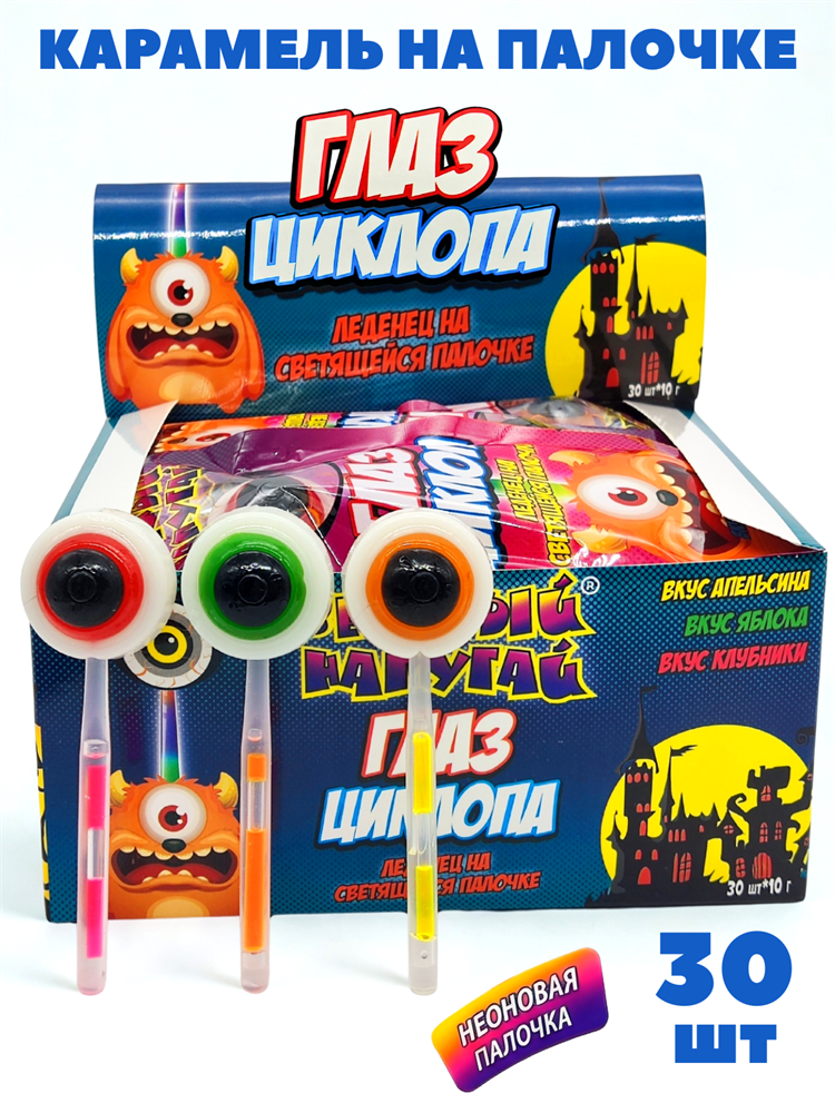 Карамель леденцовая на светящейся палочке Глаз Циклопа (Веселый напугай) (CL-302) 10 гр*12 бл*30 шт