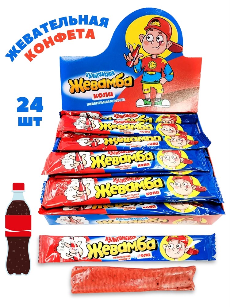 Жевательная конфета со вкусом колы в полимерной упаковке. Товар упакован в картонном блоке с вложением 24 штуки.